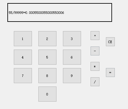 实际操作中,我发现由于存在各种输入的情况,比如连续输入两个加号,或者连续输入两个等于号或是除0,这种情况都会导致程序终止,所以我们使用一个变量flag来记录当前的符号数,当符号数为0时,符号只接受+,-,*,/,之后把符号数+1,当符号数为1时,只接受=号,此时符号数再加1,当符号数为2时,就进行完一组运算了,此时若接受到数字,就把符号数和文本框文字清空,重新计算,这样程序就不会被非法输入所干扰了。