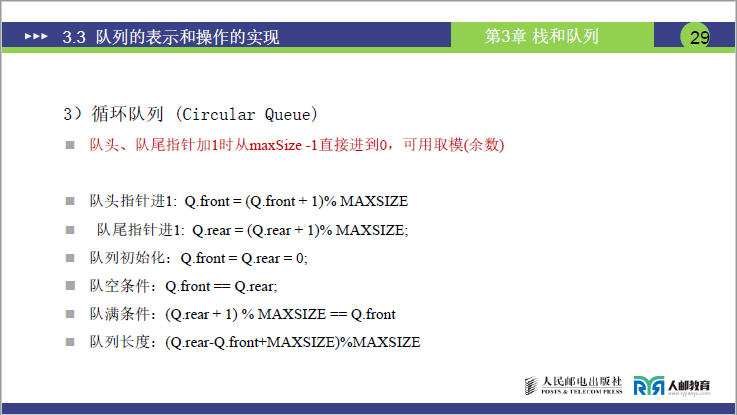 rear:Q.rear = (Q.rear + 1) % maxSize(实现环状跳转);