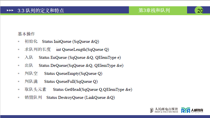 | 销毁队列 | Status DestroyQueue(LinkQueue &Q) |