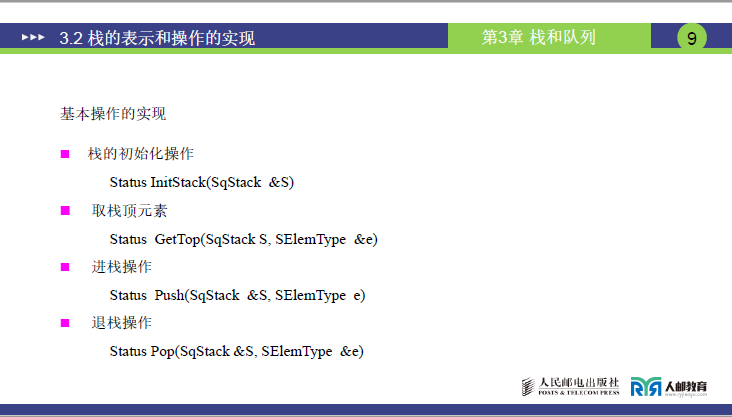 | 退栈操作 | Status Pop(SqStack &S, SElemType &e) |