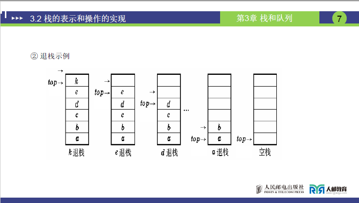 top向下移动 1 位(指向k所在的存储单元),再取出k;此时栈内元素为a、b、...、e。 - e 退栈:重复上述操作 —— 先移