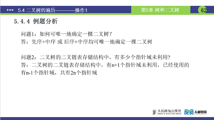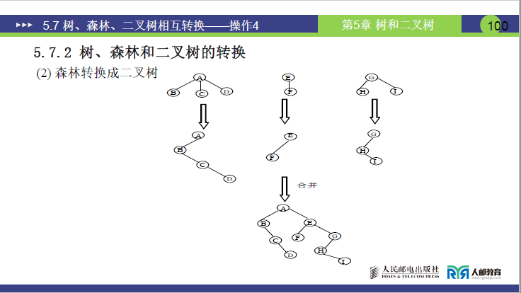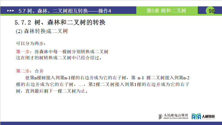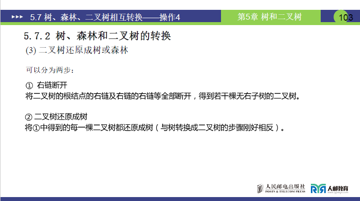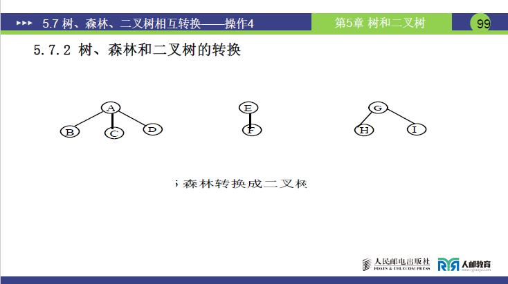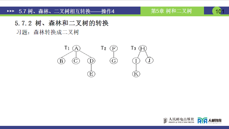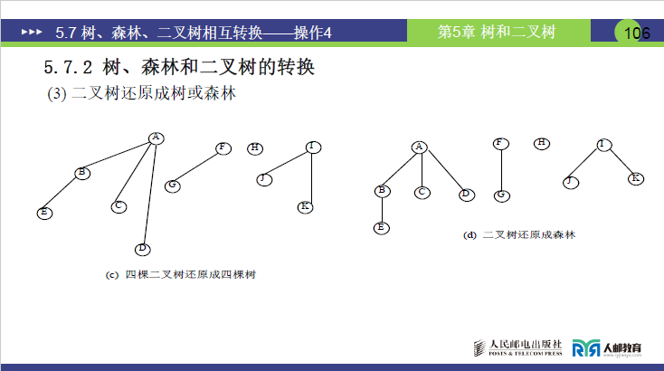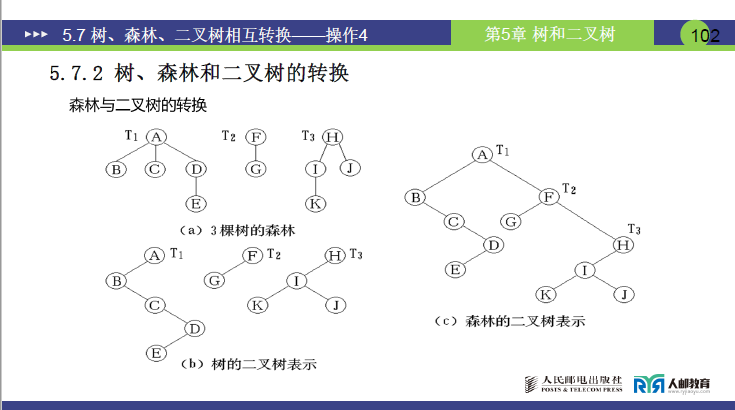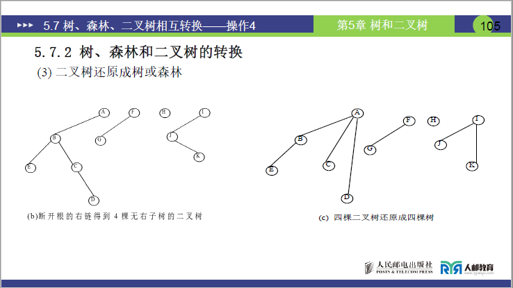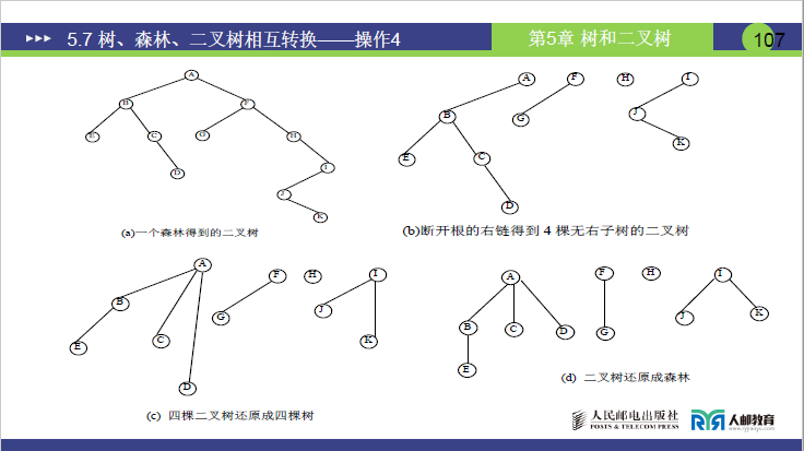 - 课件案例:某森林对应的二叉树,断开右链后得到 4 棵无右子树的二叉树,对应原森林的 4 棵树。