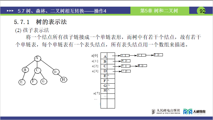 data域和指向其孩子链表的指针); - 每个结点的所有孩子构成一个单链表(链表结点存储孩子在数组中的下标)。