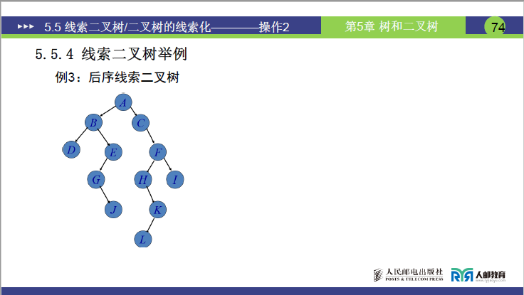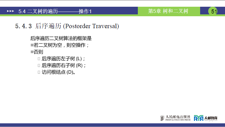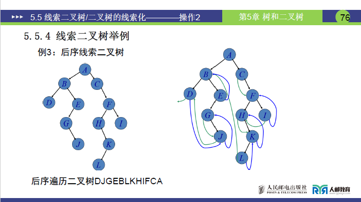 - 课件案例:上述树的后序遍历为E→B→C→A。