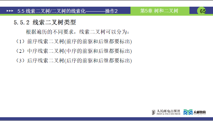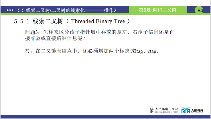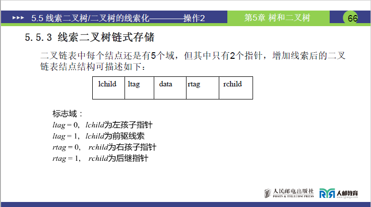 - 原理:采用类似二叉链表的结构,每个结点含 3 个域: