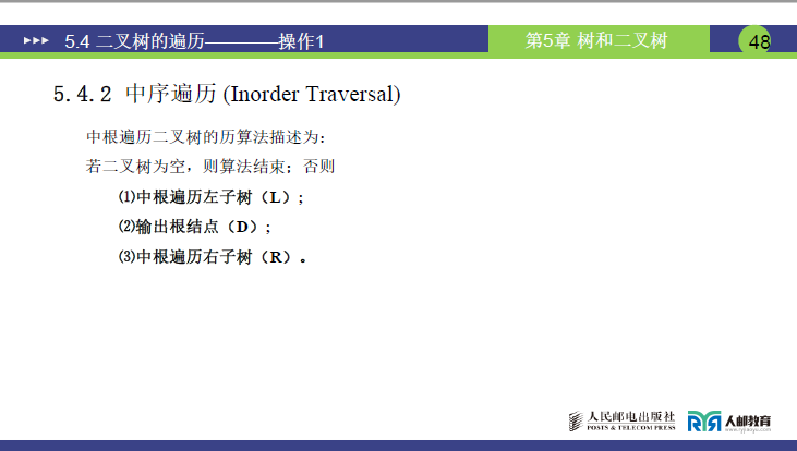 - 课件案例:森林 {T1(根 A,孩子 B)、T2(根 C,孩子 D)} 的先序遍历为A→B→C→D。