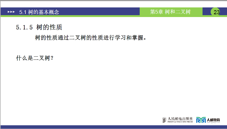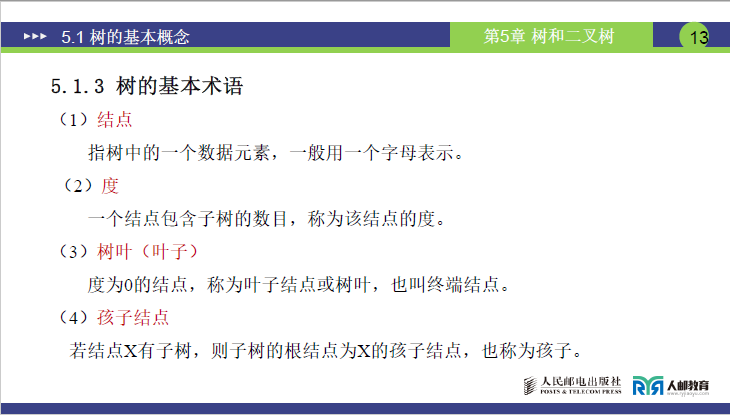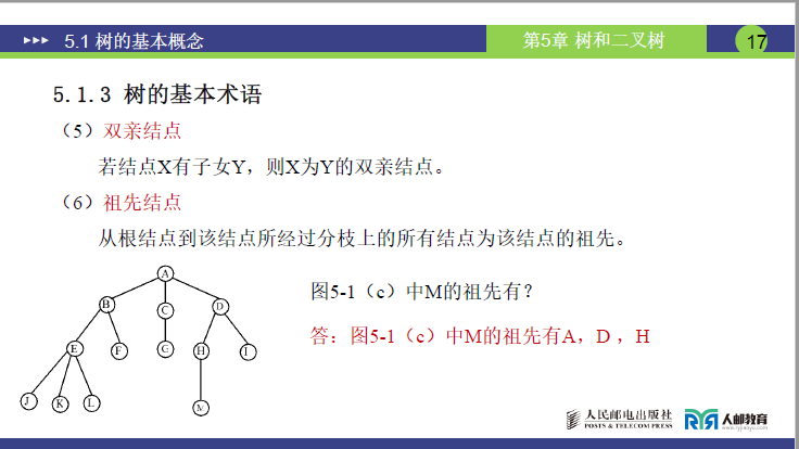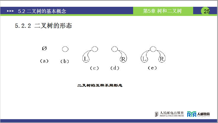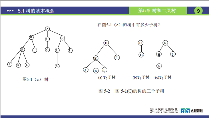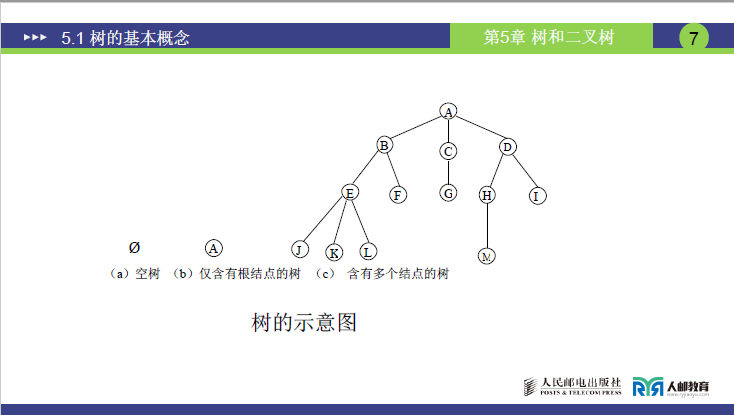 - 含多个结点的树:根结点下挂载若干子树,子树又包含自身的子树,是最常见的树形态(如课件中图 5-1 (c) 的树,根结点 A 下有 3 棵子树)。