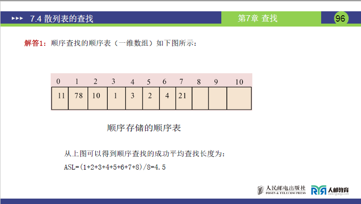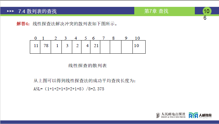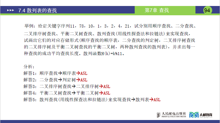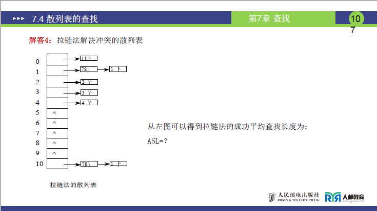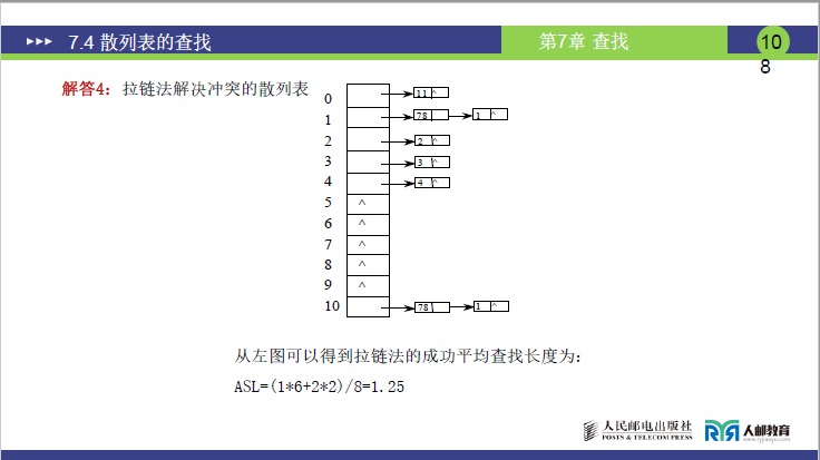 - 老师强调:链地址法的 ASL(1.25)是所有方法中最低的,体现了散列查找的高效性。