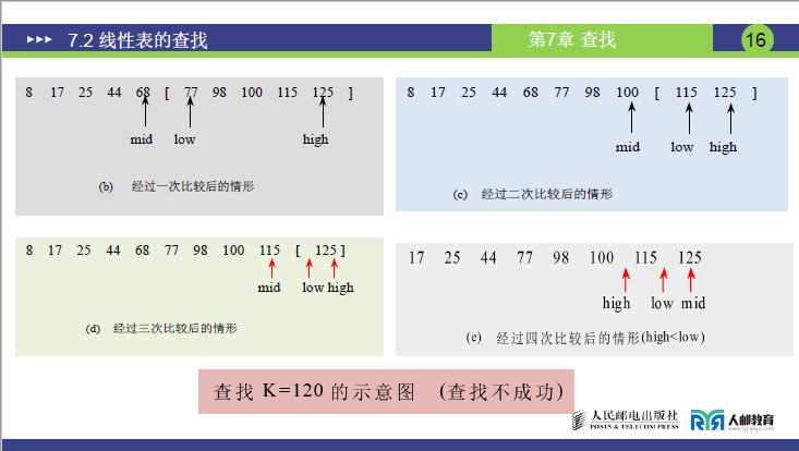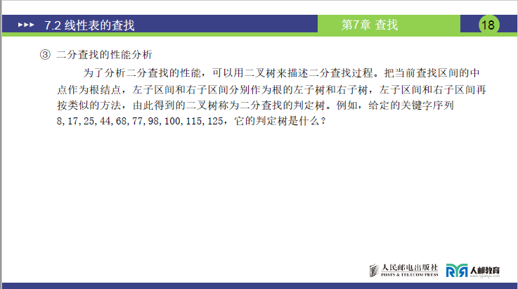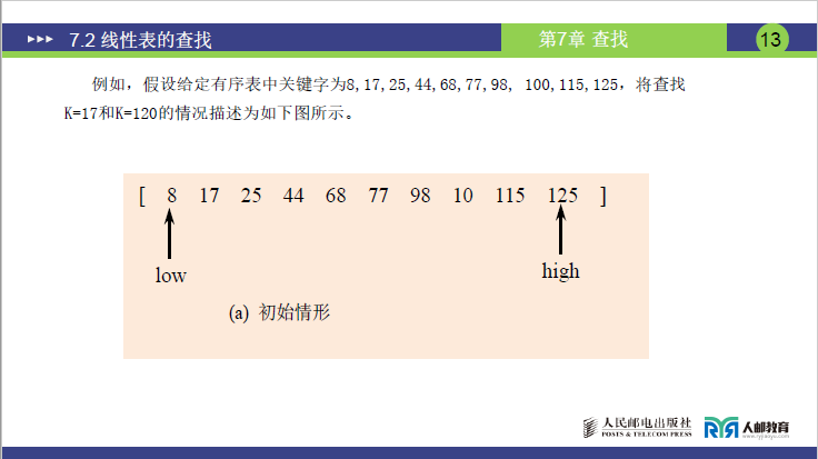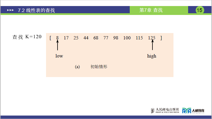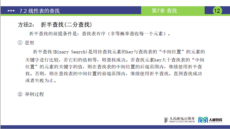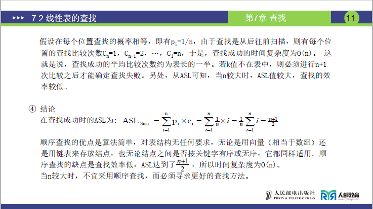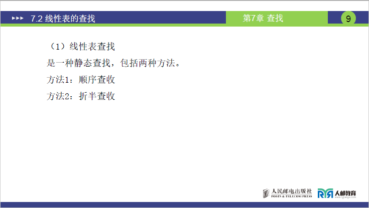 7.2 线性表的查找是静态查找(查找过程中不改变查找表结构)的核心内容,是后续树表、散列表查找的基础。其核心框架围绕两种经典方法展开:顺序查找(适用于简单场景)和折半查找(适用于高效场景),需重点掌握两种方法的思想、过程、性能分析及适用场景,尤其关注平均查找长度(ASL) 的计算(查找性能的核心衡量指标)。