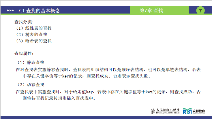 - 课件核心定义:对查找表实施静态查找时,查找表的组织结构可以是顺序表结构,也可以是单链表结构;若表中存在关键字值等于k**ey的记录,则查找成功;否则表示查找失败(不修改查找表)。