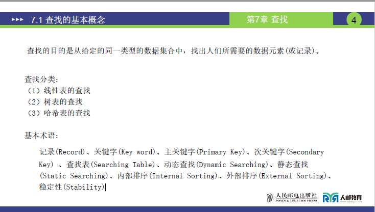 - 后续重点:顺序查找、折半查找(二分查找)、分块查找。