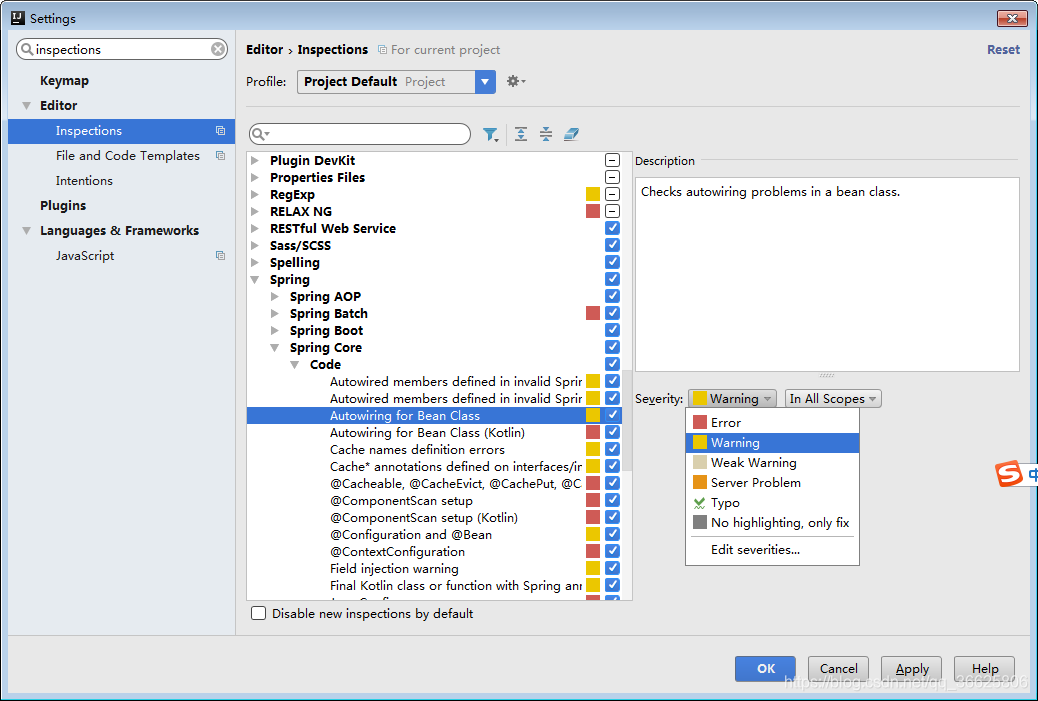 我们在设置搜索inspections->选择Spring->Spring Code ->Autowiring for Bean Class,将Severity设置为Waring