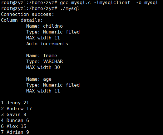 #include <stdio.h> #include <stdlib.h> #include <mysql/mysql.h> MYSQL *mysql_main; MYSQL_RES *res_ptr; MYSQL_ROW sqlrow; void display_header(); void display_row(); int main(int argc,char *argv[]) { int res; int first_row = 1; mysql_main = mysql_init(NULL); if(!mysql_main) { fprintf(stderr,"mysql_init failed\n"); return EXIT_FAILURE; } mysql_main = mysql_real_connect(mysql_main,"localhost","root","123","test",0,NULL,0); if(mysql_main) { printf("Connection success:\n"); res = mysql_query(mysql_main,"SELECT childno,fname,age FROM children WHERE age>5"); if(res) { fprintf(stderr,"SELECT error: %s\n",mysql_error(mysql_main)); } else { res_ptr = mysql_use_result(mysql_main); if(res_ptr) { while((sqlrow = mysql_fetch_row(res_ptr))) { if(first_row) { display_header(); first_row = 0; } display_row(); } } } } else { printf("Connection failed\n"); } mysql_close(mysql_main); return EXIT_SUCCESS; } void display_header() { MYSQL_FIELD *field_ptr; printf("Column details:\n"); while((field_ptr = mysql_fetch_field(res_ptr))!=NULL) { printf("\t Name: %s\n",field_ptr->name); printf("\t Type: "); if(IS_NUM(field_ptr->type)) { printf("Numeric filed\n"); } else { switch(field_ptr->type) { case FIELD_TYPE_VAR_STRING: printf("VARCHAR\n"); break; case FIELD_TYPE_LONG: printf("LONG\n"); break; default: printf("Type is %d,check in mysql_com.h\n",field_ptr->type); } } printf("\t MAX width %ld\n",field_ptr->length); if(field_ptr->flags&AUTO_INCREMENT_FLAG) printf("\t Auto increments\n"); printf("\n"); } } void display_row() { unsigned int field_count; field_count = 0; while(field_count<mysql_field_count(mysql_main)) { if(sqlrow[field_count]) printf("%s ",sqlrow[field_count]); else printf("NULL"); field_count++; } printf("\n"); }