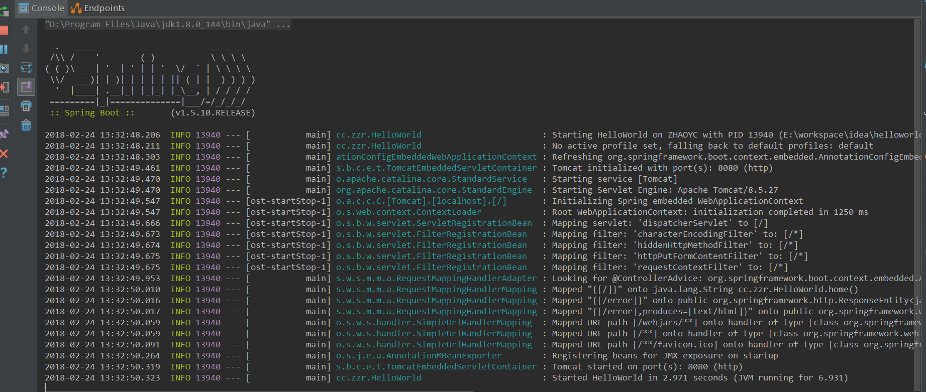 package cc.zzr; import org.springframework.boot.SpringApplication; import org.springframework.boot.autoconfigure.EnableAutoConfiguration; import org.springframework.web.bind.annotation.RequestMapping; import org.springframework.web.bind.annotation.RestController; @RestController @EnableAutoConfiguration public class HelloWorld { @RequestMapping("/") String home() { return "Hello World!"; } public static void main(String[] args) { SpringApplication.run(HelloWorld.class, args); } }