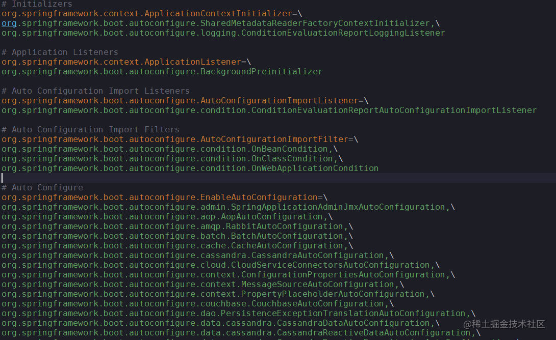 这就是很清楚了,就是一堆KV键值对,key是EnableAutoConfiguration全类名,value则是一大堆全类名列表,代表了自动装配的类。