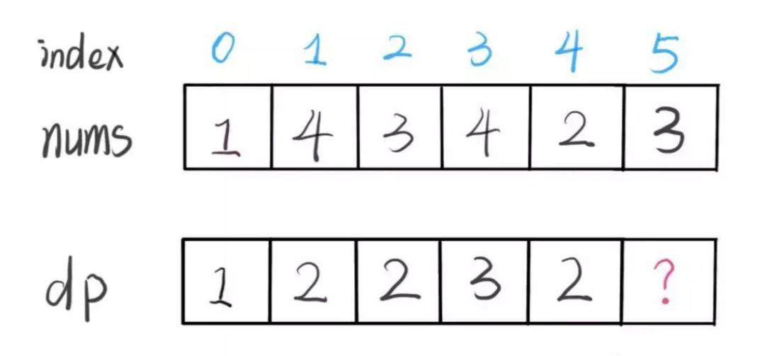 此时你打算计算dp[5]的值,而且nums[5] = 3。那么在前面1 4 3 4 2 这些数中,只要有一个数比nums[5] = 3要小,我们自然可以把nums[5] = 3这个数放到它后面组成一个递增子序列,考虑到这一步,dp[5]就好求了。首先我们看看nums[0] = 1这个数,是的比3小,所以3可以放到1后面,组成一个递增子序列。而且我们还知道dp[0] = 1,也就是说以nums[0] = 1这个元素结尾的最长递增子序列长度为1,我们把3放到这个子序列后面就可以组成一个长度为2的递增子序列,我们就暂时令dp[5] = dp[0] + 1=2;接着看nums[1] = 4,哎比3要大,没办法,下一个;下一个是nums[2] = 3,等于3,不行,递增子序列要求后一个比前一个要大,相等也不行,下一个;下一个是nums[3] = 4,同理不行,下一个;下一个是nums[4] = 2,比3要小,可以,我们可以把3放在这个2后面组成一个递增序列,又知道dp[4] = 2,所以前面以nums[4] = 2这个元素结尾的最长递增子序列长度为2,那也就是说,我们把3放到这个以nums[4] = 2为结尾的最长递增子序列后面可以得到一条长度加1的递增子序列,所以此时可以组成长度为dp[4] + 1 = 3的递增子序列。上一次在index = 0的时候,我们暂时令dp[5] = 2,到index = 4的时候,我们又发现nums[5] 可以和nums[4]组成长度为3的递增子序列,比之前的2更大了,所以我们重新令dp[5] = 3。