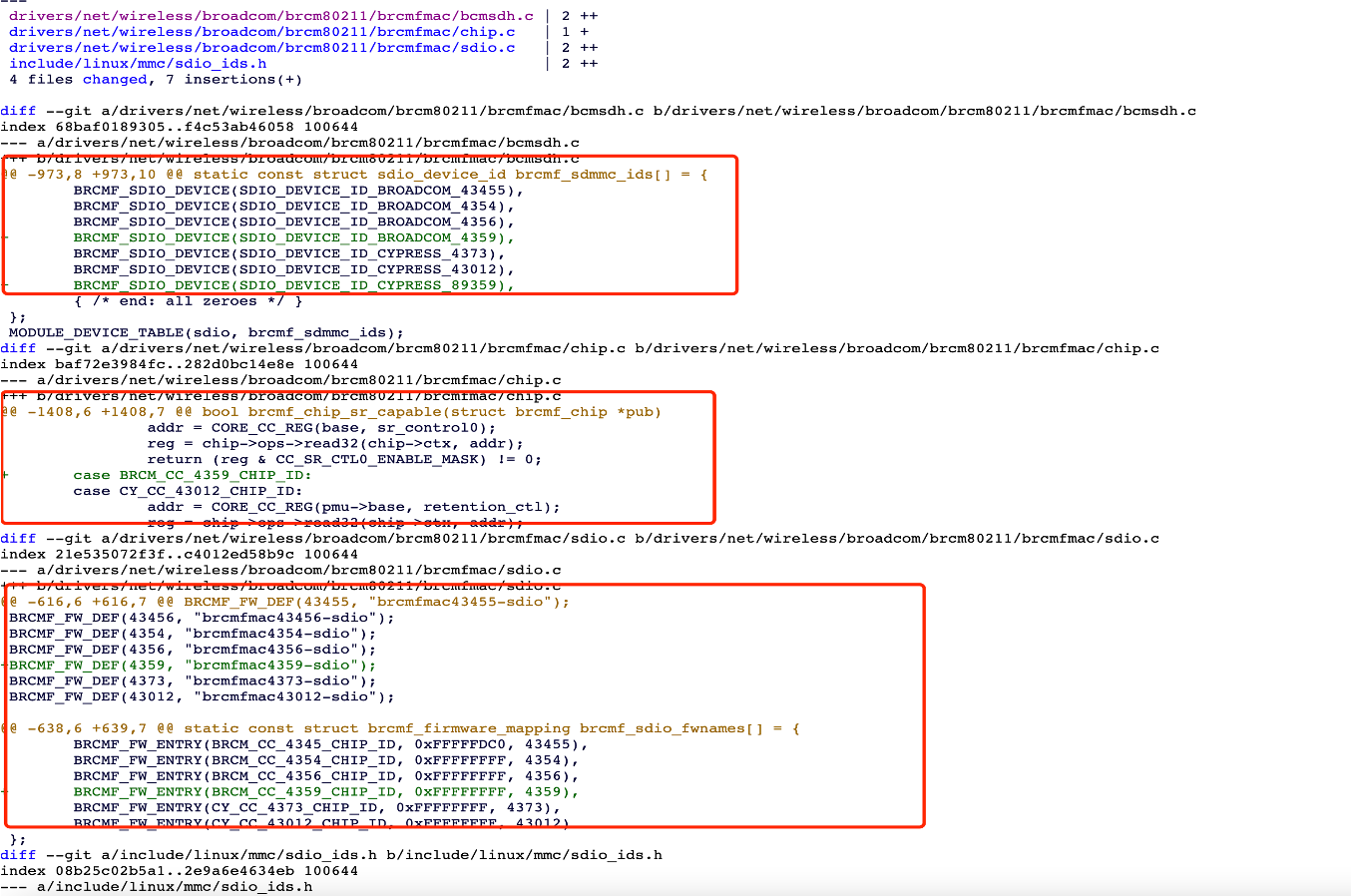 发现输出的结果中并没有预期的brcmfmac驱动,本次适配未成功。于是我转换思路,进行第二次适配。通过查阅国外论坛,在kernel官网(kernel.org)的讨论区,我找到了一篇关于该芯片的讨论“brcmfmac:add support for BCM4359 SDIO chipset”发现较新版本的kernel已对AP6398S的芯片做了适配,新旧版本内核主要针对以下文件做了补充:
