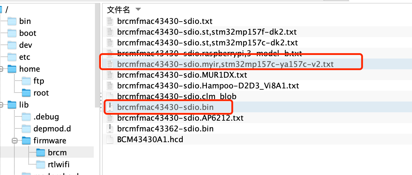 于是我对/kernel/drivers/net中的文件进行了替换处理,并补齐了缺少的.h库文件,再次进行编译,同步到开发板后,再次执行lsmod,发现开发板已经成功加载brcmfmac、cfg80211、brcmutil等组件,适配成功。但此时通过ifconfig -a命令查看系统中的网卡,仍无法发现该无线网卡,于是接下来我尝试进行替换固件处理,将下载的固件(目录结构如下图)