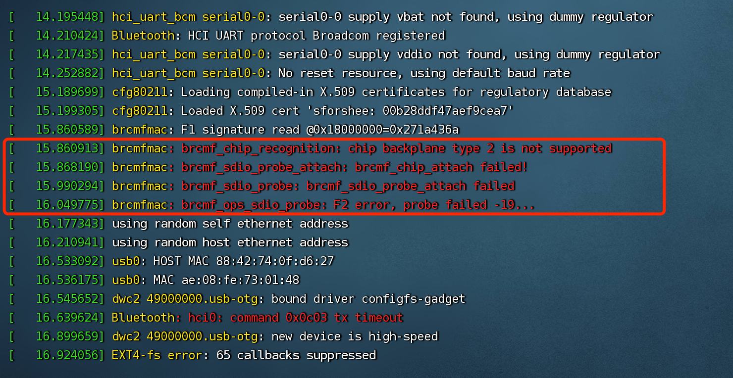 尝试重启后,仍然不能使用,此时查询启动日志发现存在如下报错信息(该报错信息与修改固件前一致):