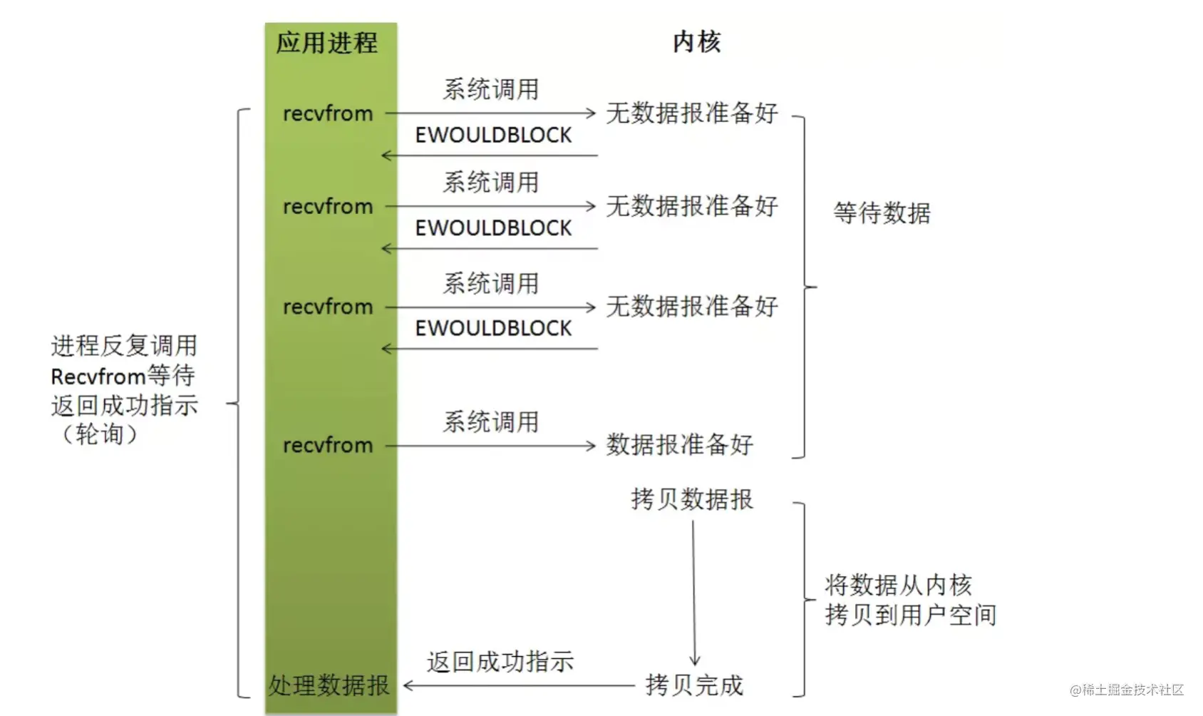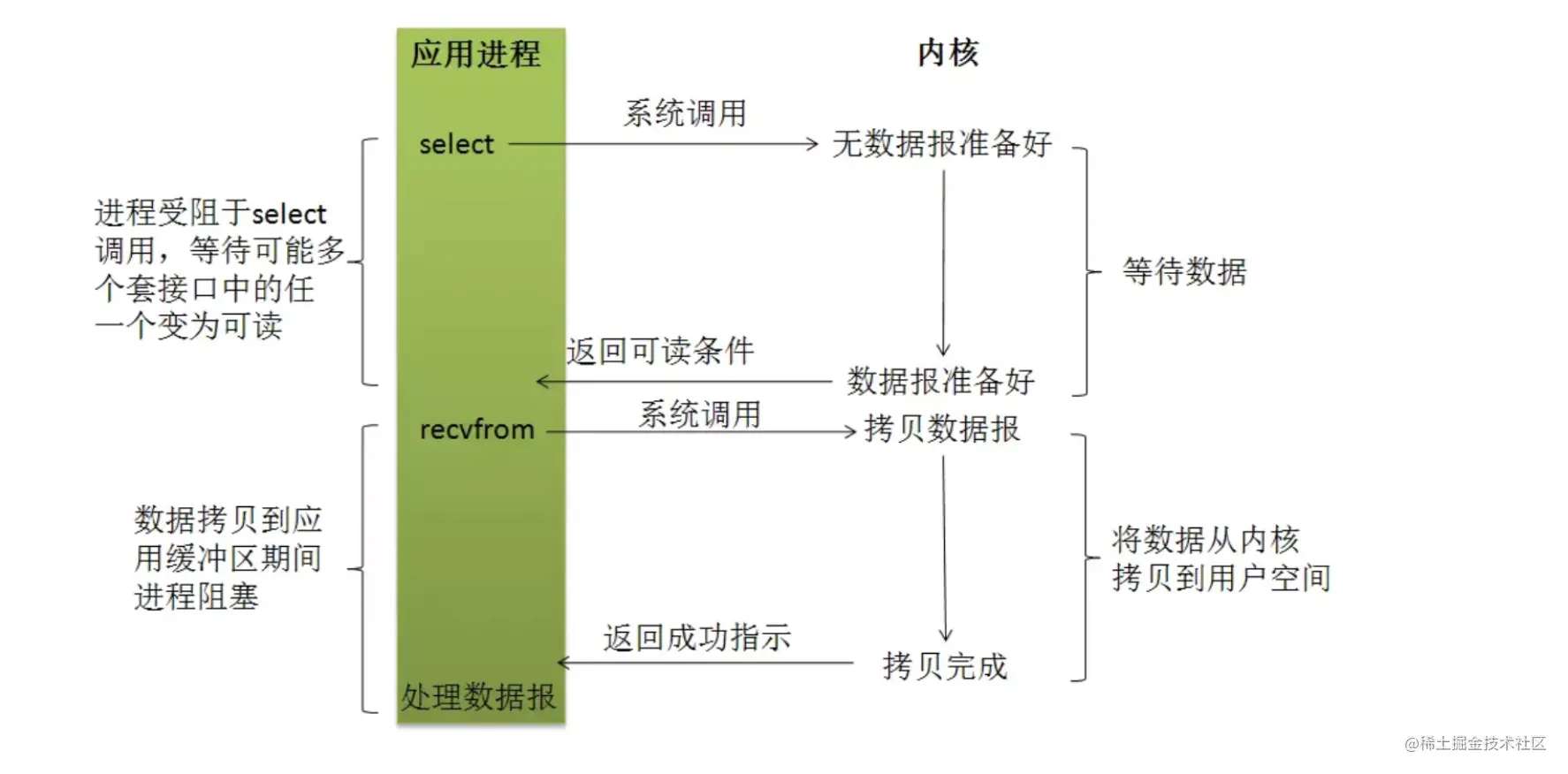 - 系统发出I/O请求,等待数据准备好(如网络I/O,等待数据从网络中到达socket;等待系统从磁盘上读取数据等)
