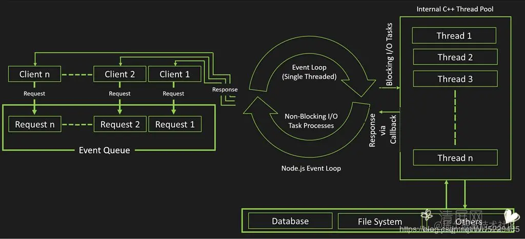 首先我们需要了解一下最基础的一些东西,比如这个事件循环,事件循环是指Node.js执行非阻塞I/O操作,尽管JavaScript是单线程的,但由于大多数内核都是多线程的,Node.js会尽可能将操作装载到系统内核。因此它们可以处理在后台执行的多个操作。当其中一个操作完成时,内核会告诉Node.js,以便Node.js可以将相应的回调添加到轮询队列中以最终执行。
