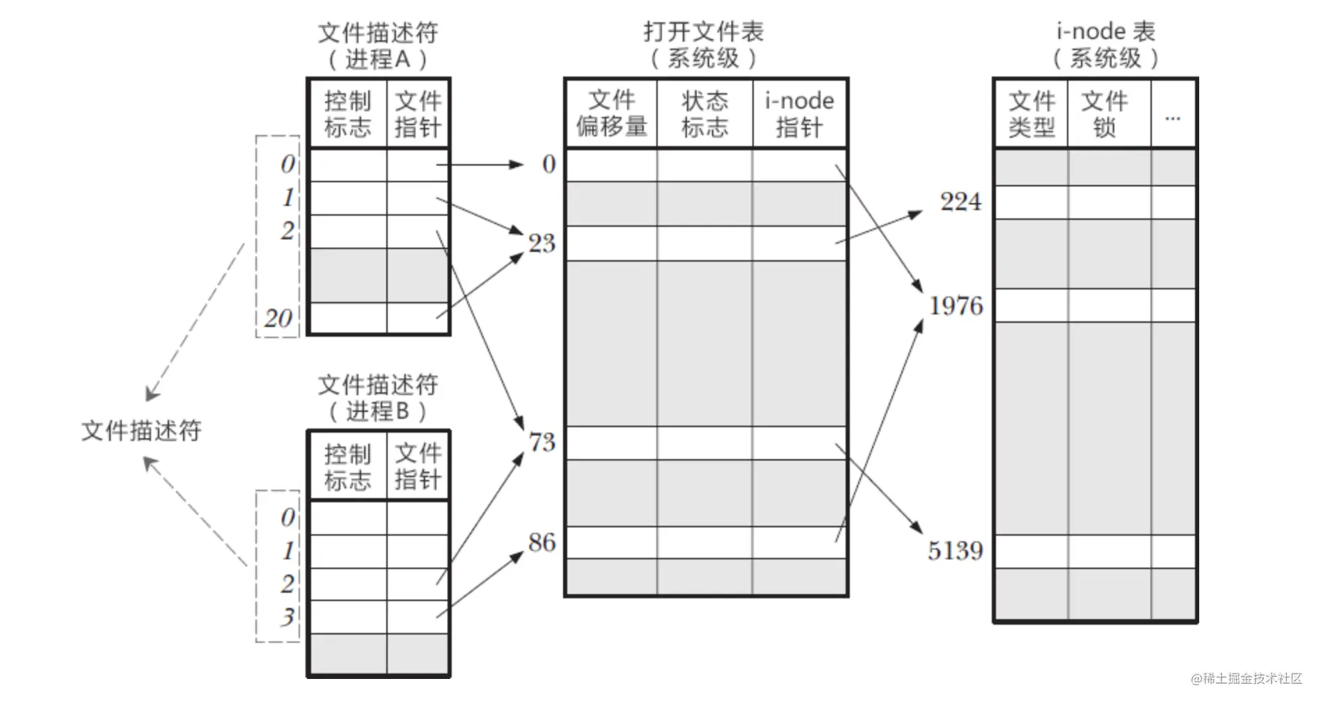 - 在进程 A 中,文件描述符1/20均指向了同一打开文件表项23,这可能是对同一文件多次调用了 open 函数形成的