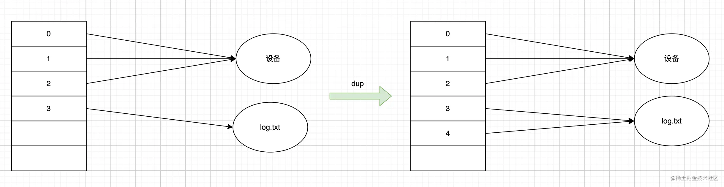 调用 dup(3) 的时候,会打开新的最小描述符,也就是4,这个4指向了3所指向的文件,操作任意一个 fd 都是修改的一个文件