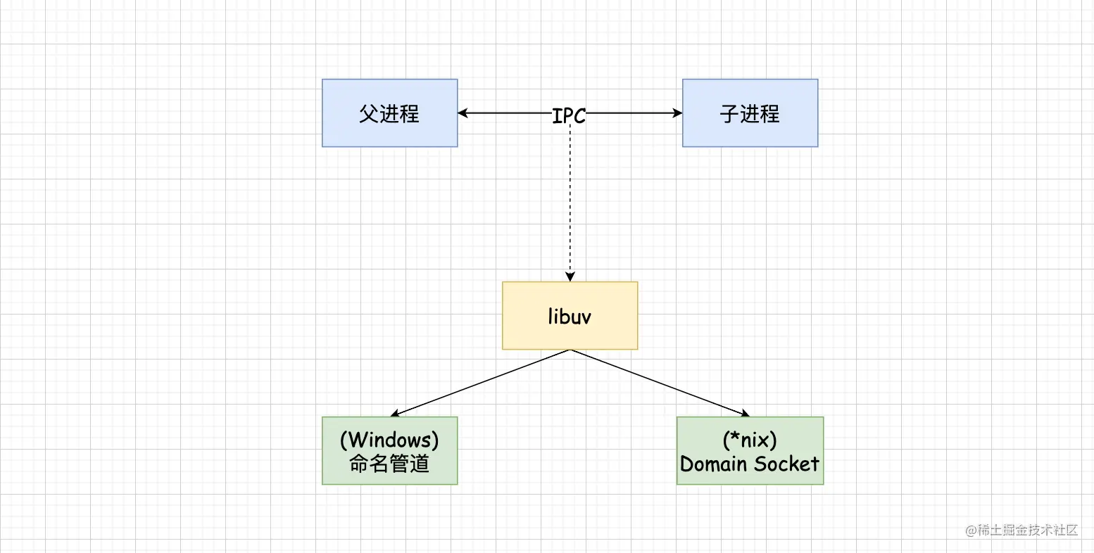 Node 中的 IPC 通道具体实现是由 libuv 提供的。根据系统的不同实现方式不同,window 下采用命名管道实现,*nix 下采用 Domain Socket 实现。在应用层只体现为 message 事件和 send 方法。