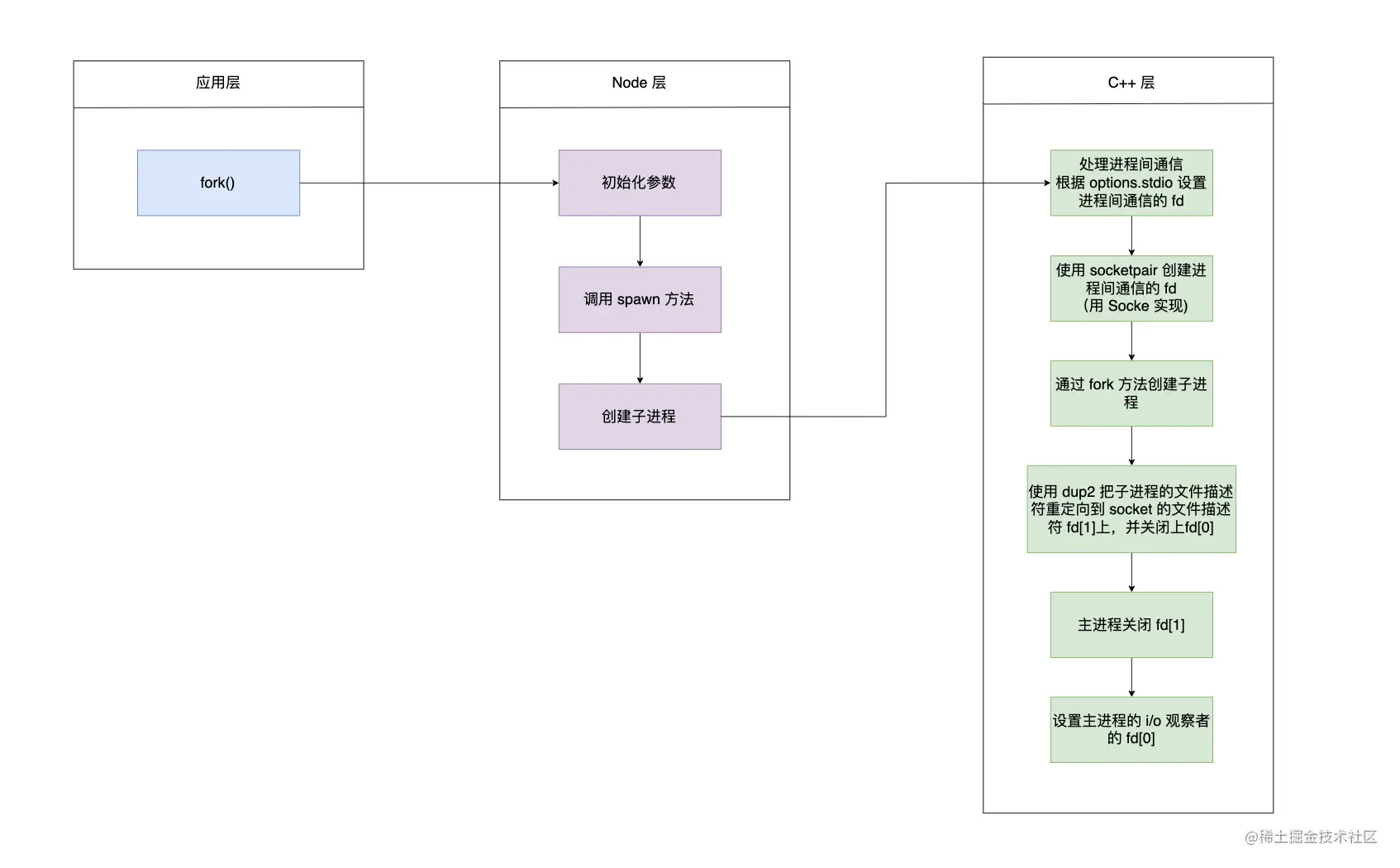 通过 child.spawn 调用到 ChildProcess.prototype.spawn 方法中。其中 getValidStdio 方法会根据 options.stdio 创建和 C++ 交互的 Pipe 对象,并获得对应的文件描述符,将文件描述符写入到环境变量 NODE_CHANNEL_FD 中,调用 C++ 层创建子进程,在调用 setupChannel 方法