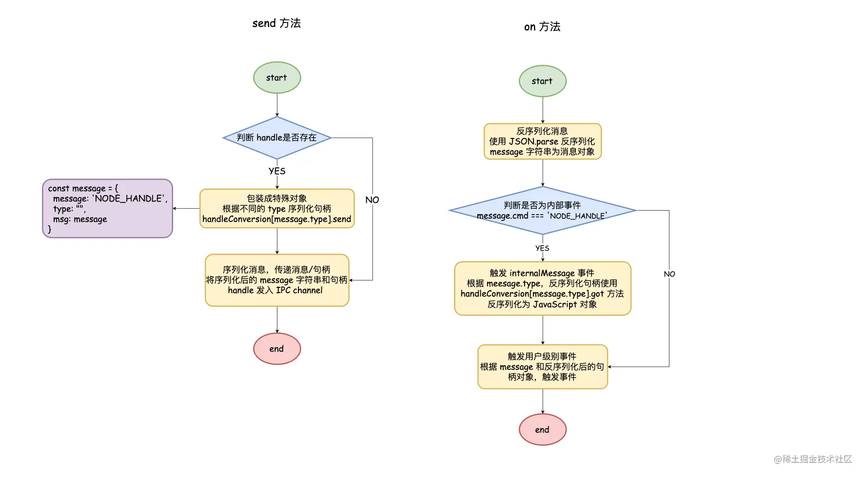 - target._send: 执行具体 send 逻辑的函数, 当参数 handle 不存在时, 表示普通的消息传递;若存在,包装为内部对象,表明是一个 internalMessage 事件触发。调用使用JSON.stringify 序列化对象, 使用channel.writeUtf8String 写入文件描述符中