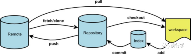 我们先来看看Git的工作原理,Git将存储库分为三个部分,一个是远程存储库,一个是本地存储库,以及一个workspace。