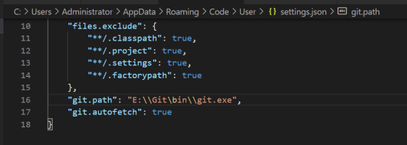然后修改git.path为我们安装Git的地址,这样将Git集成到VSCode上了。
