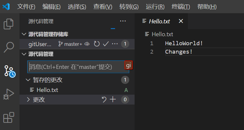 打开源代码管理使用Ctrl + Enter或者使用git commit -m命令就可以将暂存区的更改提交到本地版本库中,形成一次提交记录。