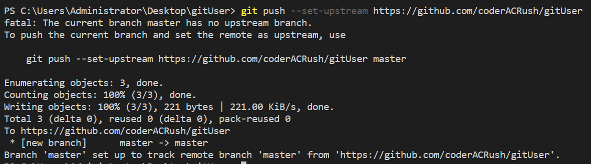 如图所示,在控制台输入git push --set-upstream https://github.com/coderACRush/gitUser命令就可以将本地版本库的提交项推送到远端版本库。