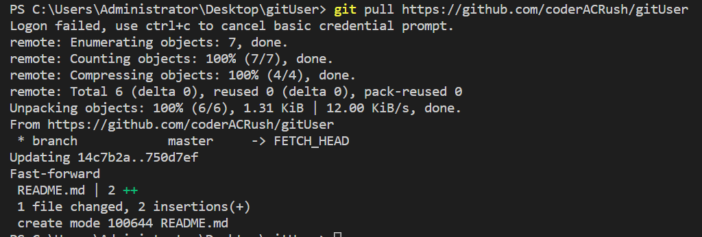 如下图所示,在控制台输入git pull https://github.com/coderACRush/gitUser命令就可以将远端版本库的内容拉取到本地版本库。