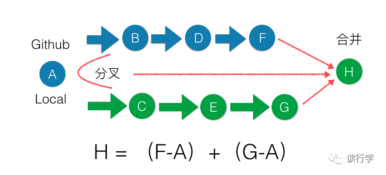 如下图所示,将分叉上的增量补丁合并到当前工作区G中,解决冲突后就可以形成版本H。