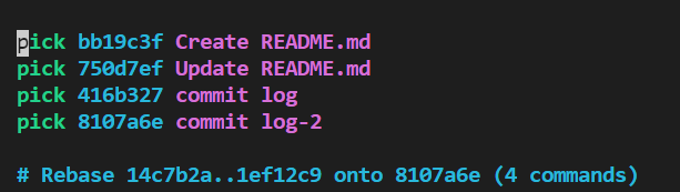 在控制台输入git rebase -i HEAD^^^命令可以显示最近的版本提交记录,如下图所示。