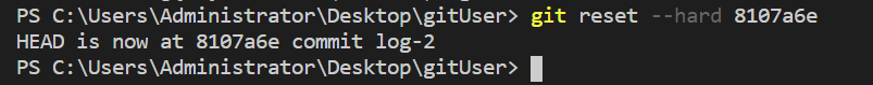 然后使用git reset --hard commit-id可以转到任意一个版本,比如下图中commit log-2的commit-id是8107a6e,