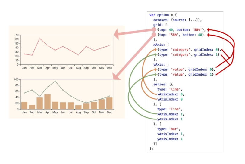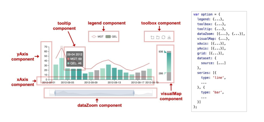 在系列之上,echarts 中各种内容,被抽象为“组件”。例如,echarts 中至少有这些组件:xAxis(直角坐标系 X 轴)、yAxis(直角坐标系 Y 轴)、grid(直角坐标系底板)、angleAxis(极坐标系角度轴)、radiusAxis(极坐标系半径轴)、polar(极坐标系底板)、geo(地理坐标系)、dataZoom(数据区缩放组件)、visualMap(视觉映射组件)、tooltip(提示框组件)、toolbox(工具栏组件)、series(系列)、...