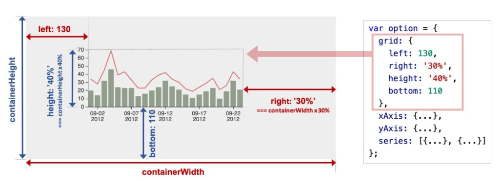 多数组件和系列,都能够基于 top / right / down / left / width / height 绝对定位。 这种绝对定位的方式,类似于 CSS 的绝对定位(position: absolute)。绝对定位基于的是 echarts 容器 DOM 节点。