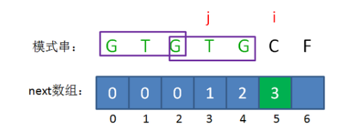 如在上图中,当前最长可匹配长度是3 ,下一个需要比较的P中元素的下标值也是3,也就是模式串中的T