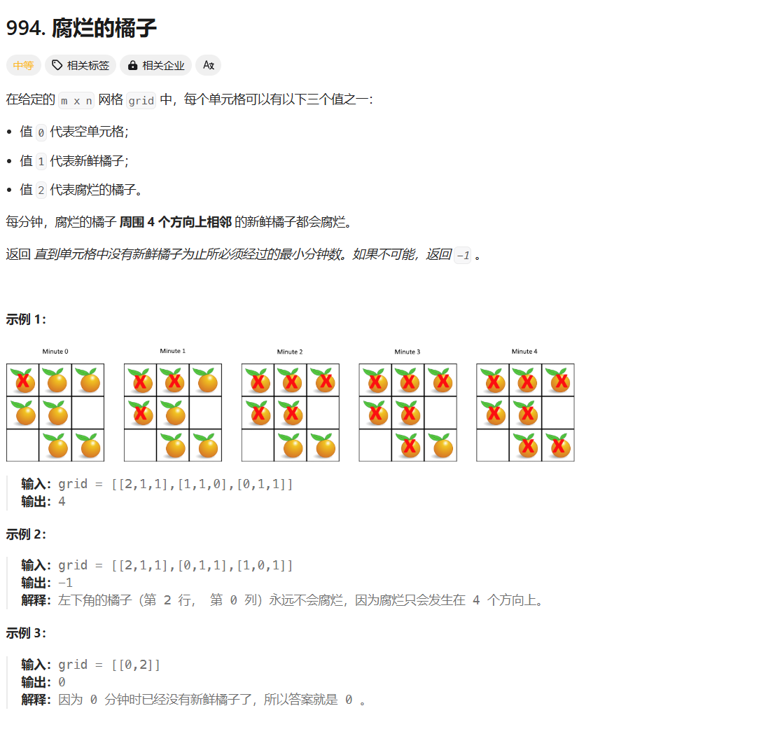 1 class Solution { 2 public: 3 typedef pair<int, int> pii; 4 vector<pii> start; //起点集合 5 bool visited[15][15]; 6 vector<vector<int>> grid; 7 int m, n; 8 vector<pii> temp; 9 int result = 0; 10 int oranges = 0; //记录新鲜橘子个数 11 void bfs(vector<pii> q, int step) { 12 result = max(result, step); 13 vector<pii> temp; 14 for (auto i : q) { 15 int x = i.first, y = i.second; 16 if (x + 1 < m && grid[x + 1][y] == 1 && !visited[x + 1][y]) { 17 visited[x + 1][y] = true; 18 oranges--; 19 temp.push_back(make_pair(x + 1, y)); 20 } 21 if (x - 1 >= 0 && grid[x - 1][y] == 1 && !visited[x - 1][y]) { 22 visited[x - 1][y] = true; 23 oranges--; 24 temp.push_back(make_pair(x - 1, y)); 25 } 26 if (y + 1 < n && grid[x][y + 1] == 1 && !visited[x][y + 1]) { 27 visited[x][y + 1] = true; 28 oranges--; 29 temp.push_back(make_pair(x, y + 1)); 30 } 31 if (y - 1 >= 0 && grid[x][y - 1] == 1 && !visited[x][y - 1]) { 32 visited[x][y - 1] = true; 33 oranges--; 34 temp.push_back(make_pair(x, y - 1)); 35 } 36 } 37 if (!temp.empty()) 38 bfs(temp, step + 1); 39 } 40 int orangesRotting(vector<vector<int>>& grid) { 41 m = grid.size(); 42 n = grid[0].size(); 43 this -> grid = grid; 44 for (int i = 0; i < m; ++i) { 45 for (int j = 0; j < n; ++j) { 46 if (grid[i][j] == 2) { 47 start.push_back(make_pair(i, j)); 48 } else if (grid[i][j] == 1) { 49 oranges++; 50 } 51 } 52 } 53 memset(visited, false, sizeof(visited)); 54 bfs(start, 0); 55 if (oranges > 0) 56 return -1; 57 return result; 58 } 59 };