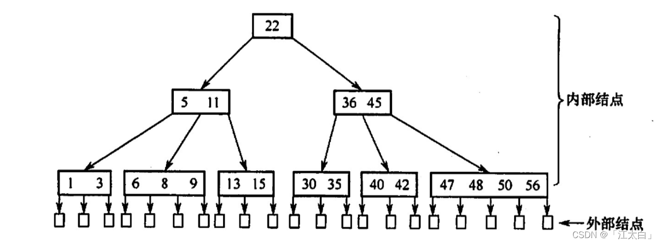 - 叶结点:表示不在方框内的数字范围,该图中有21个叶结点,例如(30, 35)就是一个叶结点,表示这个范围内的数字在B树里都查不到