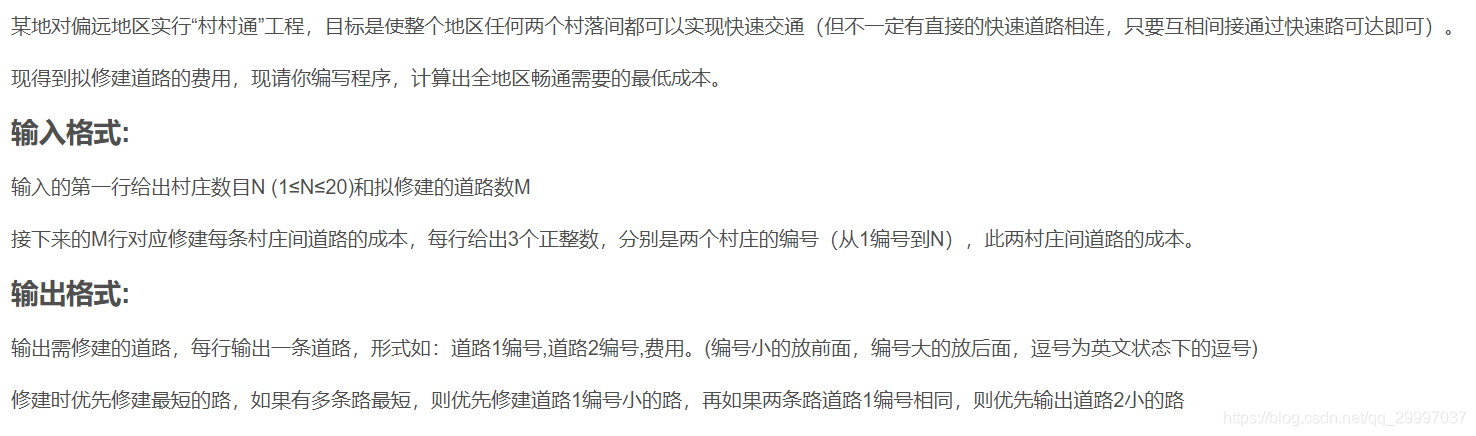 唯一需要注意的是,题目为了输出的唯一性,要求依次优先考虑修建路程最短、道路1编号最小、道路2编号最小,因此只需要在原本的按照边排序中加入两个新要求就可以满足题意了。