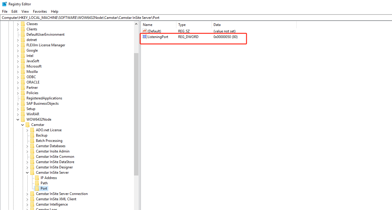 路径:"HKEY_LOCAL_MACHINE\SOFTWARE\WOW6432Node\Camstar\Camstar InSite Server\Port"