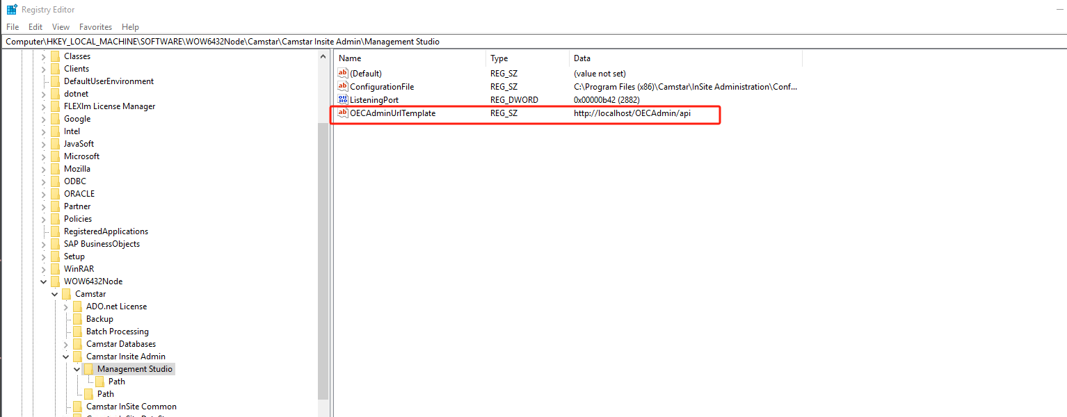 路径:"HKEY_LOCAL_MACHINE\SOFTWARE\WOW6432Node\Camstar \Camstar Insite Admin\Management Studio"