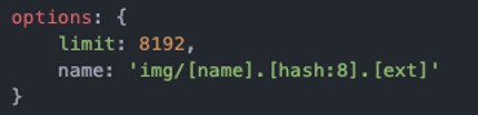 - 将打包的图片重命名。---------------> 在webpack.config.js配置文件的 options选项中 加上以下配置:name: 'img/[name].[hash:8].[ext]'