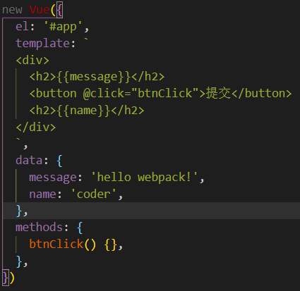 ②在Vue实例中,定义一个template属性,将展示数据放在template属性下(编译之后,el和template同时存在时,会将template 的内容替换el属性对应html标签),如下图