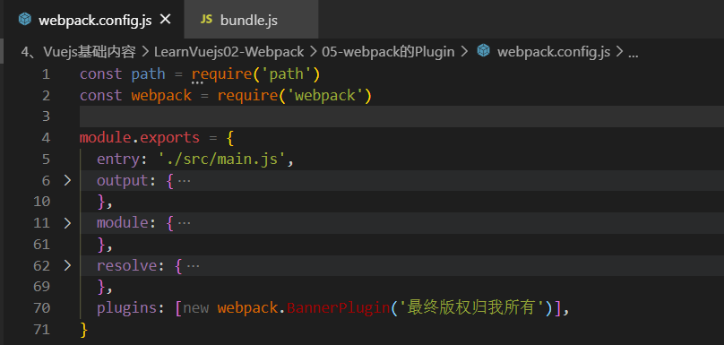 配置:module.exports = { plugins: [new webpack.BannerPlugin('最终版权归我所有')],}