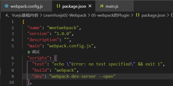 2.2.4 项目实际应用:打开package.json(“scripts”:脚本),“scripts”中添加自定义命令,关联实际执行的命令即可。
